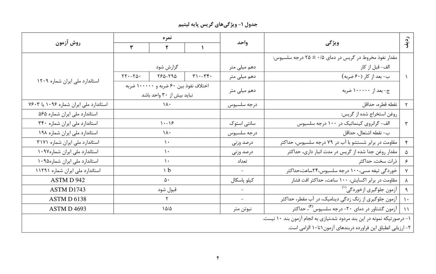 1- گریس پایه لیتیم، طبق این استاندارد باید داری ویژگی های مندرج در جدول شماره یک باشد.