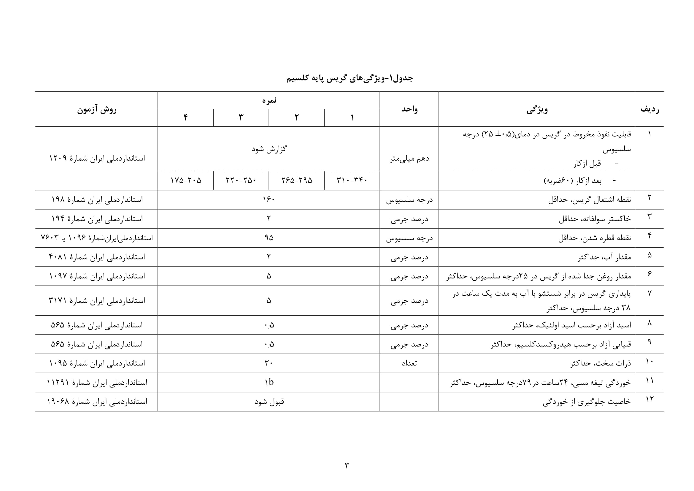 - گریس پایه کلسیم، طبق این استاندارد باید دارای ویژگی های مندرج در جدول یک باشد.