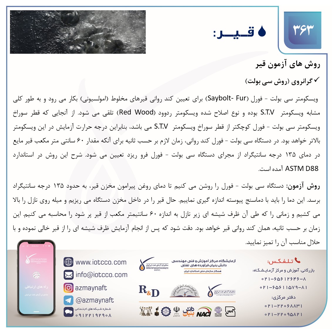 تعيين وزن مخصوص قير (بخش دوم) وزن مخصوص قیر ابزار مناسبی برای تعیین منبع قیرها می باشد. برای مثال وزن مخصوص قیرهای نفت حدود 1.0 و وزن مخصوص قیرهای قطران بسته به طرز تهیه آن ها بین 1.10 تا 1.25 متغیر است. این وزن مخصوص ها در دمای معین 15.6 تا 25 درجه سانتیگراد تعیین می شوند.