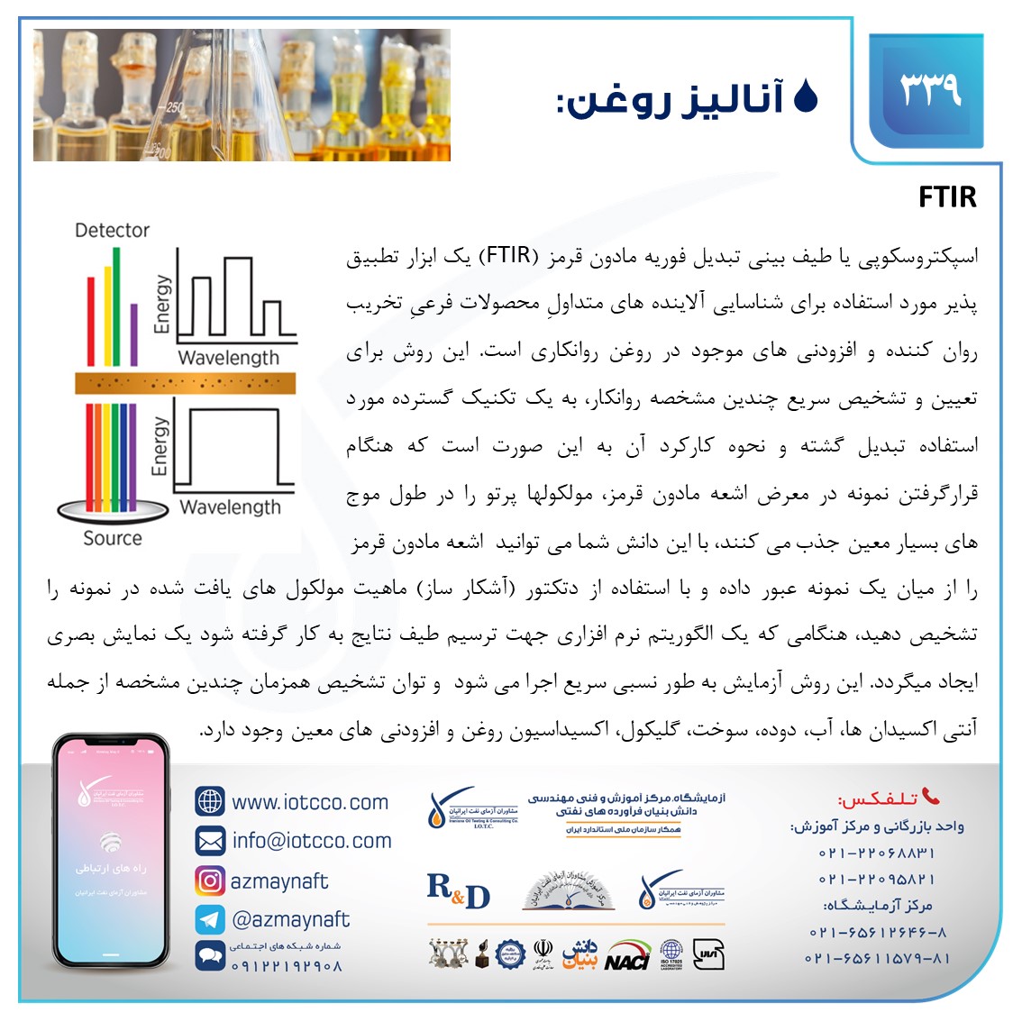 FTIR اسپکتروسکوپی یا طیف بینی تبدیل فوریه مادون قرمز (FTIR) یک ابزار تطبیق پذیر مورد استفاده برای شناسایی آلاینده های متداولِ محصولات فرعیِ تخریب روان کننده و افزودنی های موجود در روغن روانکاری است.